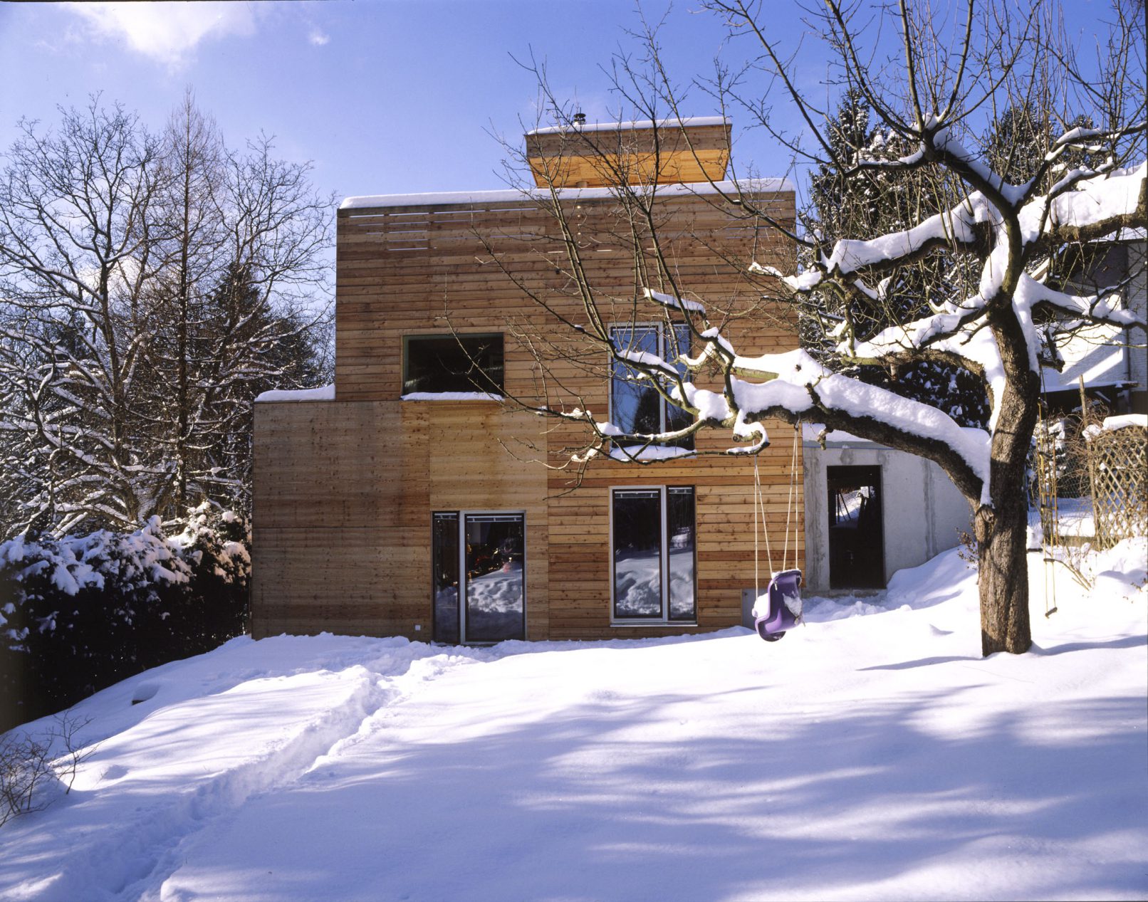 Mittlerweile hat sich das Gebälk der Pergola auch als vortreffliche Halterung für Schaukel und Trapez erwiesen, was für den Solarpreis aber weniger ausschlaggebend war. Mehr zählte da schon die ganz auf Umweltverträglichkeit ausgerichtete klima:aktiv Bauweise. Es handelt sich um einen mit Zellulose gedämmten Holzriegelbau, dem Stahlbetoninnenwände als Aussteifung und Speichermasse dienen.