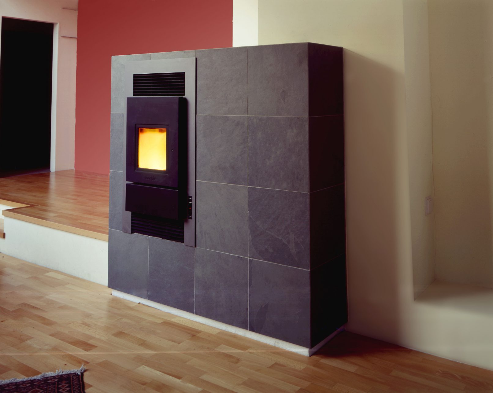 Obwohl energietechnisch „nur“ ein Niedrigenergiehaus, kamen einige Elemente aus dem Passivhaus Standard zur Anwendung, um die bauphysikalischen Werte zu optimieren. Dazu zählt die kontrollierte Wohnraumlüftung mit Wärmepumpe und Wärmerückgewinnung, womit der größte Teil des Raumwärmebedarfs abgedeckt und das Warmwasser bereitet werden. Ein Pelletsofen im Wohnzimmer und elektrische Heizkörper im Bad unterstützen während der kalten Jahreszeit. Die Fenster mit ihren sehr schlanken Profilen sind ebenfalls Passivhaus tauglich. Sie stammen aus norwegischer Produktion und haben die Sonnenschutzjalousie hinter der äußersten Schicht der Dreischeibenverglasung integriert.