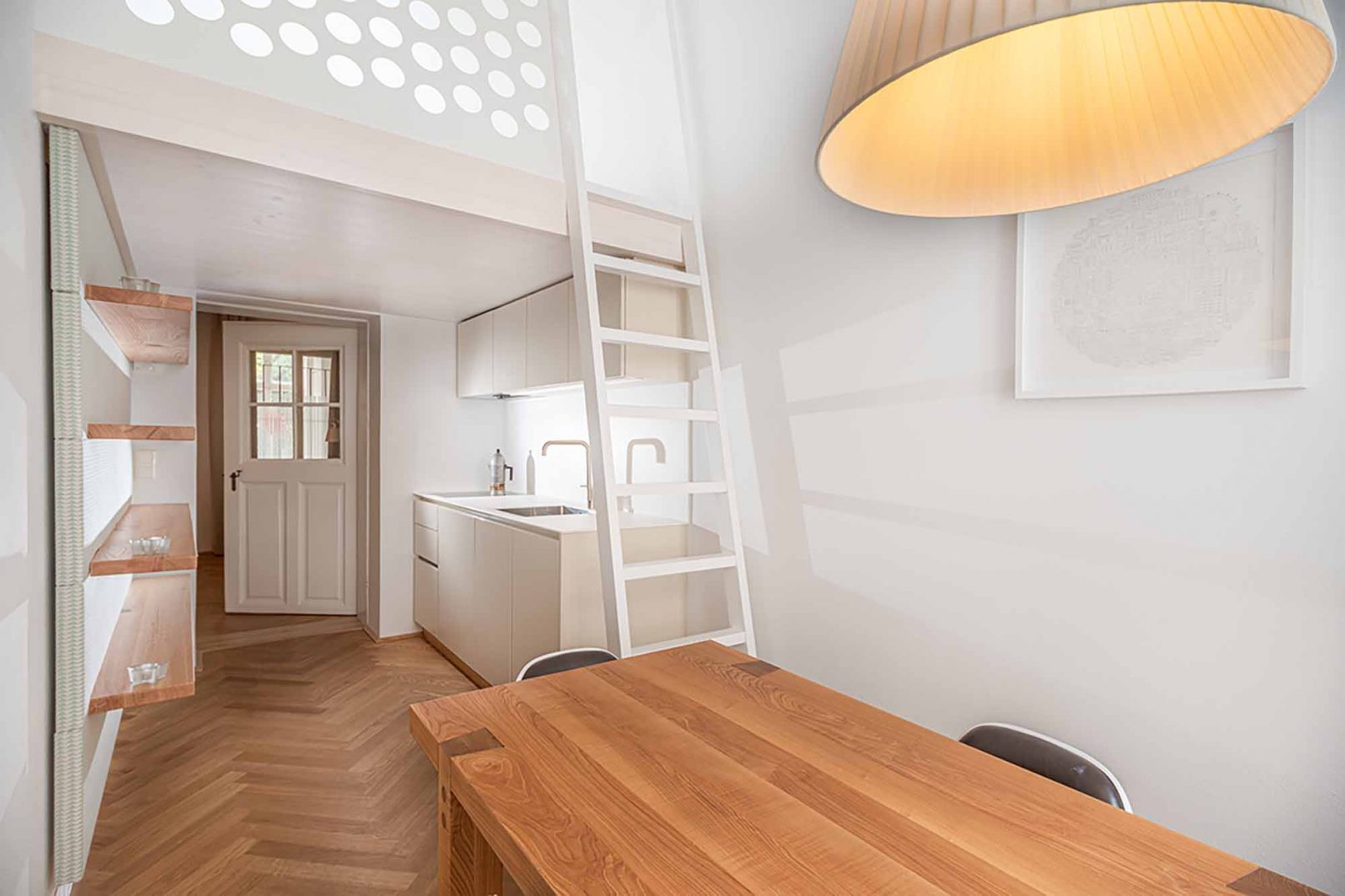 In einem 1830 erbauten Biedermeierhaus am Wiener Naschmarkt wurde ein verfallenes Geschäftslokal aus dem Dornröschenschlaf geweckt. Das Qualitätsnetzwerk ‚Sanieren.pro‘ by Abendroth Architekten präsentiert eine fachgerechte Sanierung in der Franzensgasse. Das Mauerwerk musste repariert und mit Injektagen und Wandheizung trockengelegt werden. Aus Gründen des Erdbebenschutzes wurde bei einem Durchbruch ein Stahlrahmen eingezogen. Eine Lüftungsanlage sorgt für Ruhe vor Straßenlärm. Gefilterte Raumluft hilft bei der Konzentration und spart noch dazu Energie. In den 100 m² Räumen finden ein Architekturbüro und ein kleines Appartement Platz.