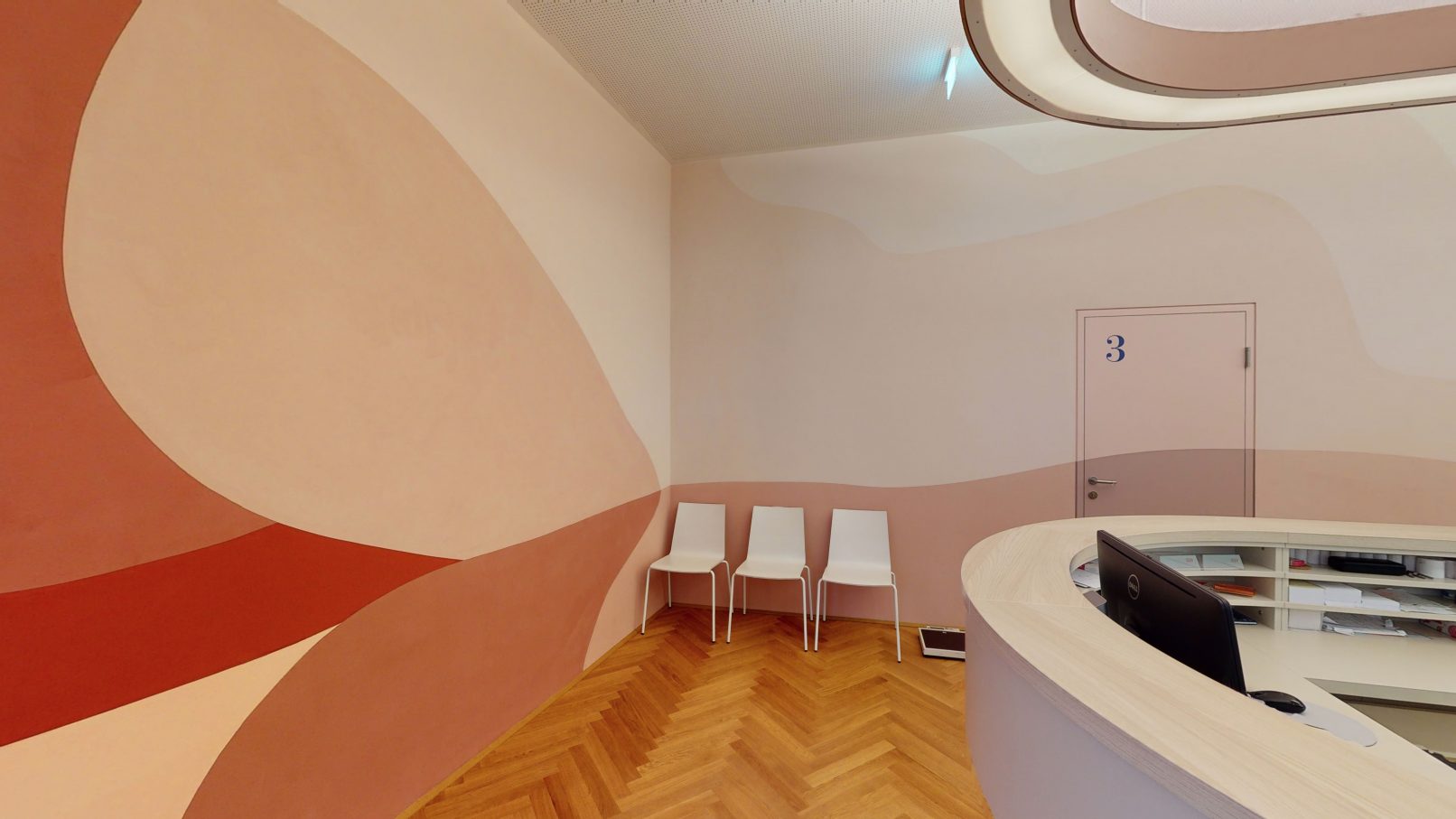 Eine Ordination für Gynäkologie sollte sich von Arztpraxen anderer Disziplinen aufgrund der nur weiblichen Patientenschaft unterscheiden. Die Gestaltung der neuen Ordinationsräumlichkeiten von Dr. Gunnar Gauff und Dr. Albert Manurung entspricht diesem Ansatz. Die ovale Form des Empfangspultes ist zwar das Resultat optimierter Funktionalität, sie entspricht aber durchaus einem weiblichen Formenkanon. Eine den Raum einnehmende Wandmalerei stellt organische Formen eleganter Weiblichkeit dar. Als Resultat entsteht eine heitere, entspannte Atmosphäre voller Geborgenheit und Entgegenkommen.