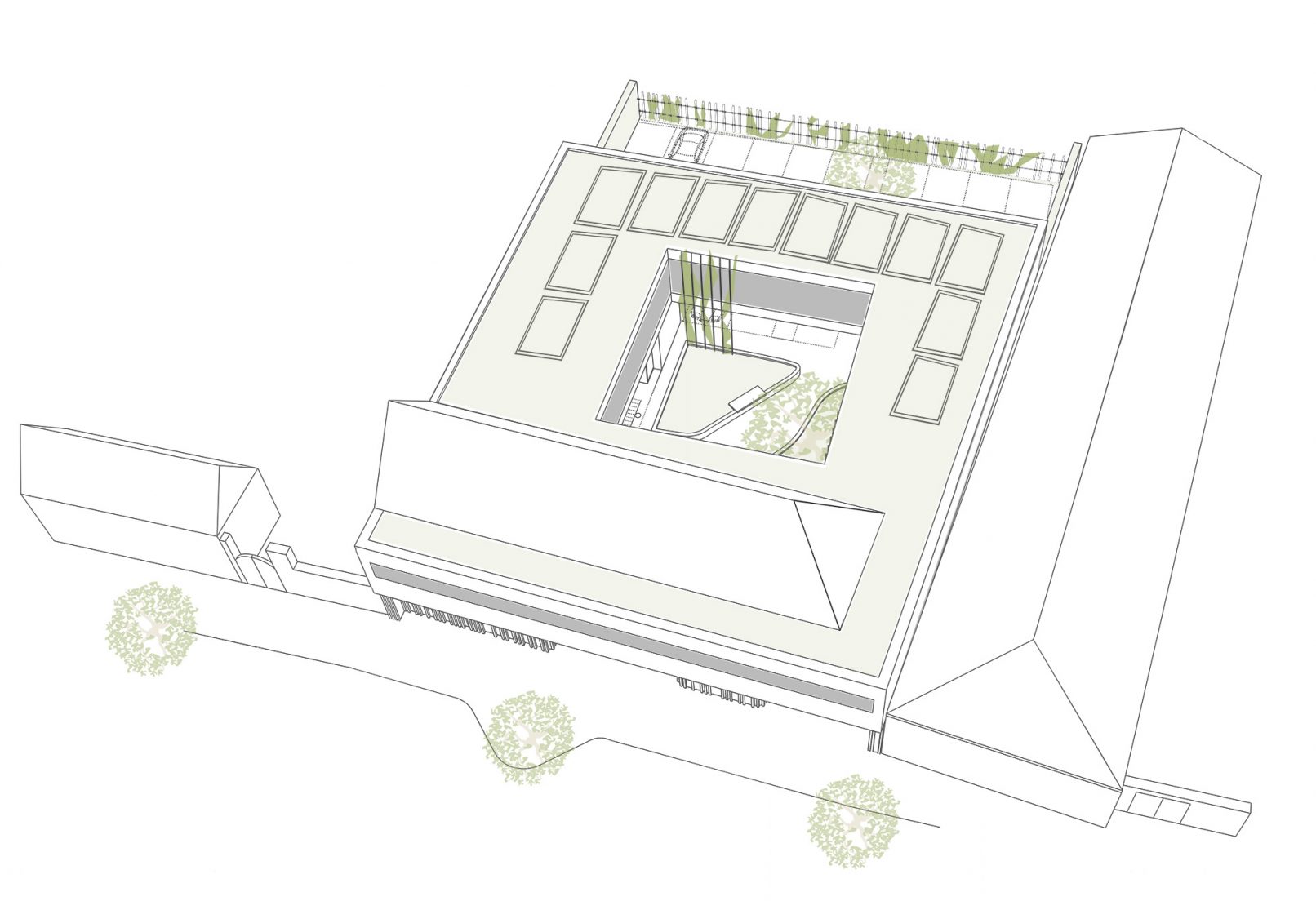 Sowohl im Gebäudetrakt als auch am Parkplatz wird darauf Wert gelegt, Vegetation situationsspezifisch zu integrieren und belebende Beziehungen zwischen Innen und Außen zu schaffen. Mehrere grüne Inseln gliedern und begleiten die tiefe Blickachse über die gesamte Länge des Grundstücks.